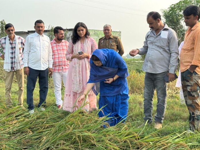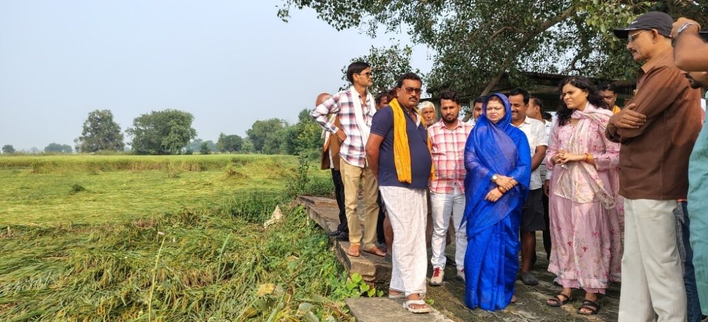 The News Point (चंदौली)- धान के कटोरे चंदौली में मोन्था चक्रवात, तूफान और तेज बारिश ने किसानों की कमर तोड़ दी है. खेतों में खड़ी धान की फसलें बुरी तरह प्रभावित हुई हैं. कई इलाकों में फसलें पूरी तरह से बिछ गईं, खेतों में पानी भर गया और किसानों को भारी आर्थिक नुकसान का सामना करना पड़ा है. किसानों की इस पीड़ा को देखते हुए राज्यसभा सांसद दर्शना सिंह ने रविवार को अपने लोकसभा क्षेत्र चंदौली के विभिन्न प्रभावित गांवो गंगेहरा, खुरुहूजा, एकौनी, बहेरा और नियामताबाद का दौरा किया. सांसद ने खेतों में जाकर किसानों से बातचीत की, फसलों के नुकसान का प्रत्यक्ष निरीक्षण किया और प्रभावित परिवारों का हाल जाना.