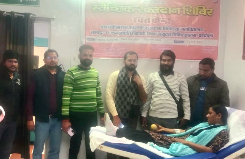 The News Point (चंदौली) : स्वामी विवेकानंद के जन्म शताब्दी अवसर पर सोमवार को राष्ट्रीय युवा दिवस धूमधाम से मनाया गया. इस दौरान जय नारायण जन कल्याण ट्रस्ट, ग्रांन वारियर्स, माँ शकंतला देवी सेवा संस्थान एवं जन सहयोग संस्थान की ओर से चंदौली ब्लड बैंक में रक्तदान शिविर एवं स्वास्थ्य परीक्षण कैम्प का आयोजन किया गया. इसका उद्धाटन ने सीएमएस डॉ प्रकाश सिंह ने किया.