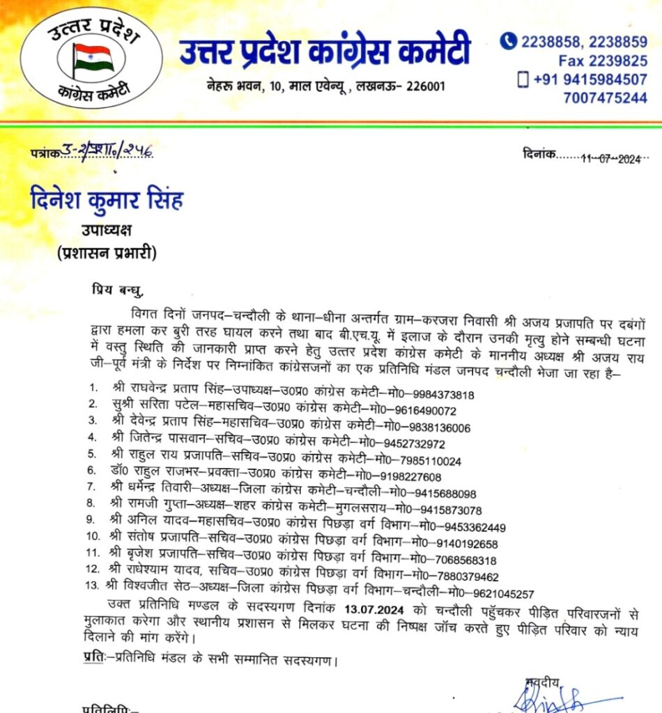 इसके अलावा प्रदेश कांग्रेस का एक 13 सदस्यीय प्रतिनिधिमंडल शनिवार को पीड़ितों से मिलने करजरा गांव जाएगा. जिसमें प्रदेश कांग्रेस के उपाध्यक्ष राघवेंद्र प्रताप सिंह, महासचिव सरिता पटेल, देवेंद्र प्रताप सिंह, सचिव जितेंद्र पासवान, राहुल राय प्रजापति, प्रवक्ता राहुल राजभर, जिलाध्यक्ष धर्मेद्र तिवारी आदि लोग शामिल रहेंगे.