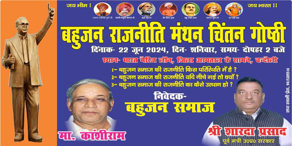 The News point (चंदौली); पूर्व विधायक व सूबे के पूर्व मंत्री शारदा प्रसाद की अगुवाई में शनिवार को भारत मैरिज लान में बहुजन राजनीति मंथन चिंतन गोष्ठी का आयोजन किया गया है. यह जानकारी देते हुए बहुजन नेता शारदा प्रसाद ने बताया कि उक्त गोष्ठी में बहुजन समाज की राजनीतिक परिस्थिति पर चर्चा की जाएगी. इसके अलावा बीते कुछ चुनावों में बहुजन समाज की राजनीति भागीदारी कम हुई है.ऐसा क्यों और किन परिस्थितियों में हुआ.